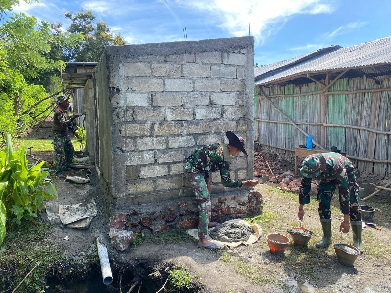 Di lokasi pembangunan, tampak personel Satgas TMMD bersama warga setempat saling bahu-membahu mencampur dan mengaplikasikan adonan semen ke dinding MCK. Serda Yerobeam Kase, yang bertindak sebagai kepala tukang, terus mengawasi proses pengerjaan agar hasilnya kuat dan tahan lama.