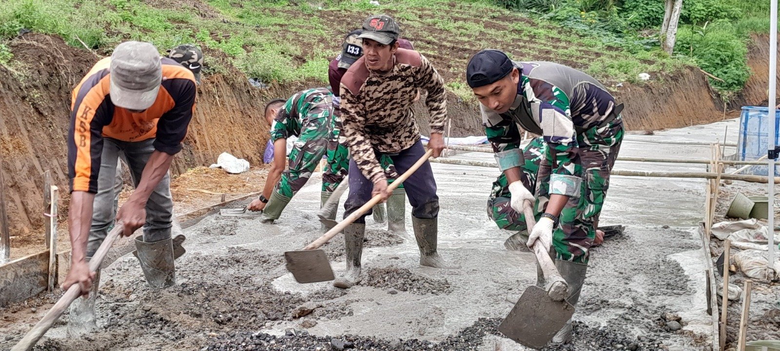 Dipimpin oleh Serka Amrizal, anggota Satgas TMMD bersama masyarakat bahu-membahu memperkuat pengecoran dengan meratakan jalan agar lebih kokoh dan tahan lama, Senin (10/3/2025).