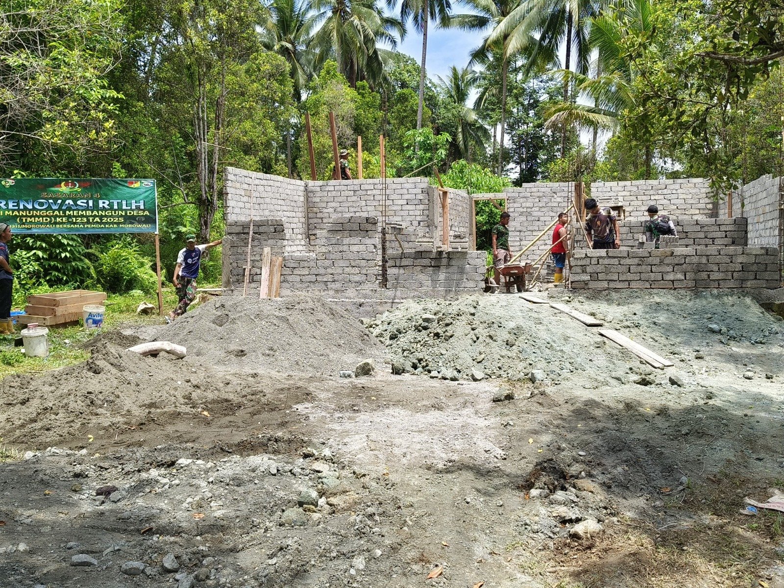 Saat ini, pembangunan rumah layak huni (RTLH) yang dikerjakan oleh Satgas TMMD Kodim 1311/Morowali telah memasuki tahap pemasangan batako. Proses pembangunan terus berjalan dengan semangat gotong royong demi mewujudkan hunian yang lebih layak bagi warga yang membutuhkan.