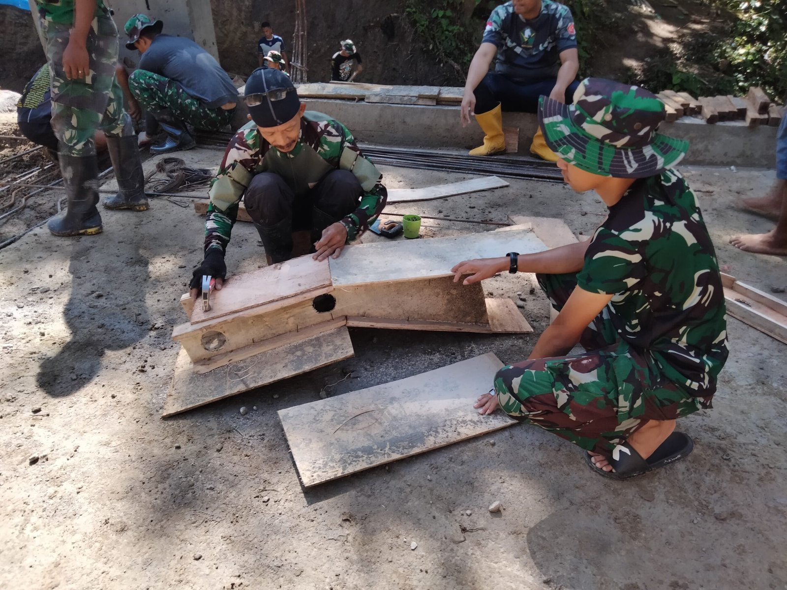 Pengerjaan ini dilakukan secara gotong royong oleh anggota Satgas TMMD bersama warga setempat. Mereka bahu-membahu menyiapkan papan, memotong, dan merakitnya sesuai ukuran yang dibutuhkan sebelum akhirnya dipasang di sisi jembatan sebagai cetakan.