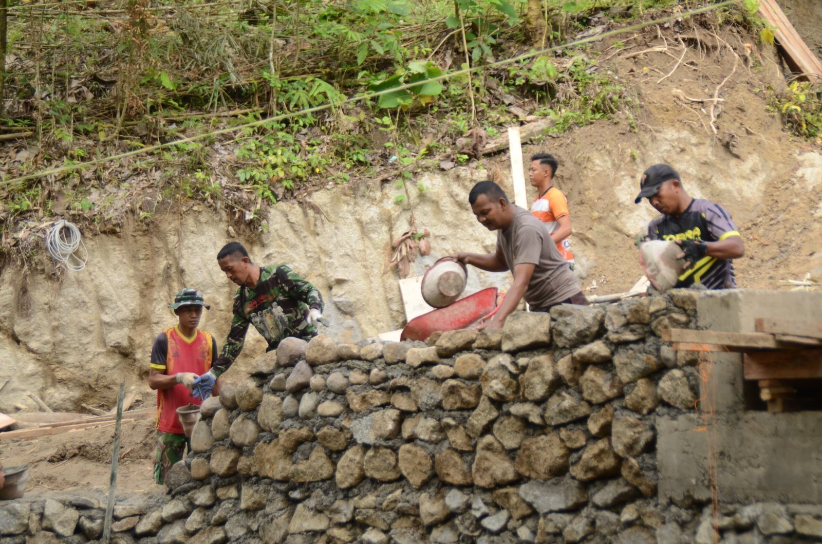 Pembangunan tanggul ini dilakukan di titik-titik rawan longsor di sepanjang jalan desa. Dengan kerja sama antara prajurit TNI dan masyarakat setempat, proses pengerjaan terus dikebut agar dapat selesai tepat waktu. Tanggul tersebut dibuat menggunakan material batu dan semen untuk memastikan ketahanan jangka panjang terhadap erosi dan curah hujan tinggi.