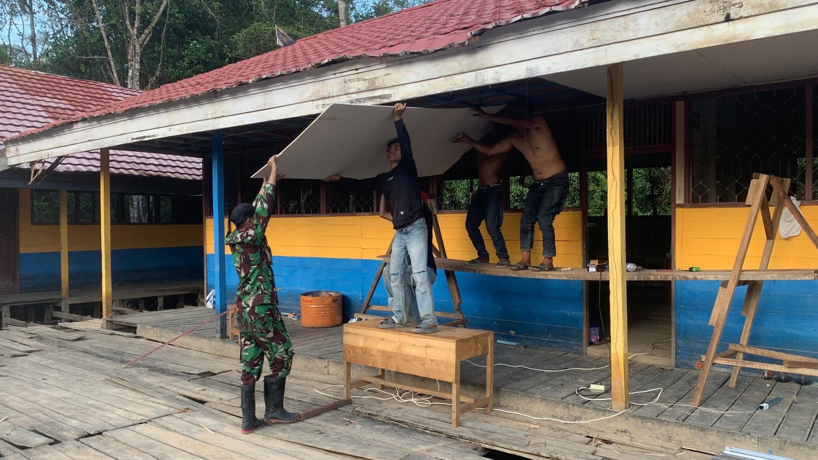 Pekerjaan ini merupakan bagian dari kegiatan rehabilitasi infrastruktur pendidikan yang menjadi sasaran TMMD tahun ini. Dengan semangat gotong royong, Satgas bersama warga setempat bergandeng tangan menyelesaikan pemasangan plafon di sekolah tersebut.