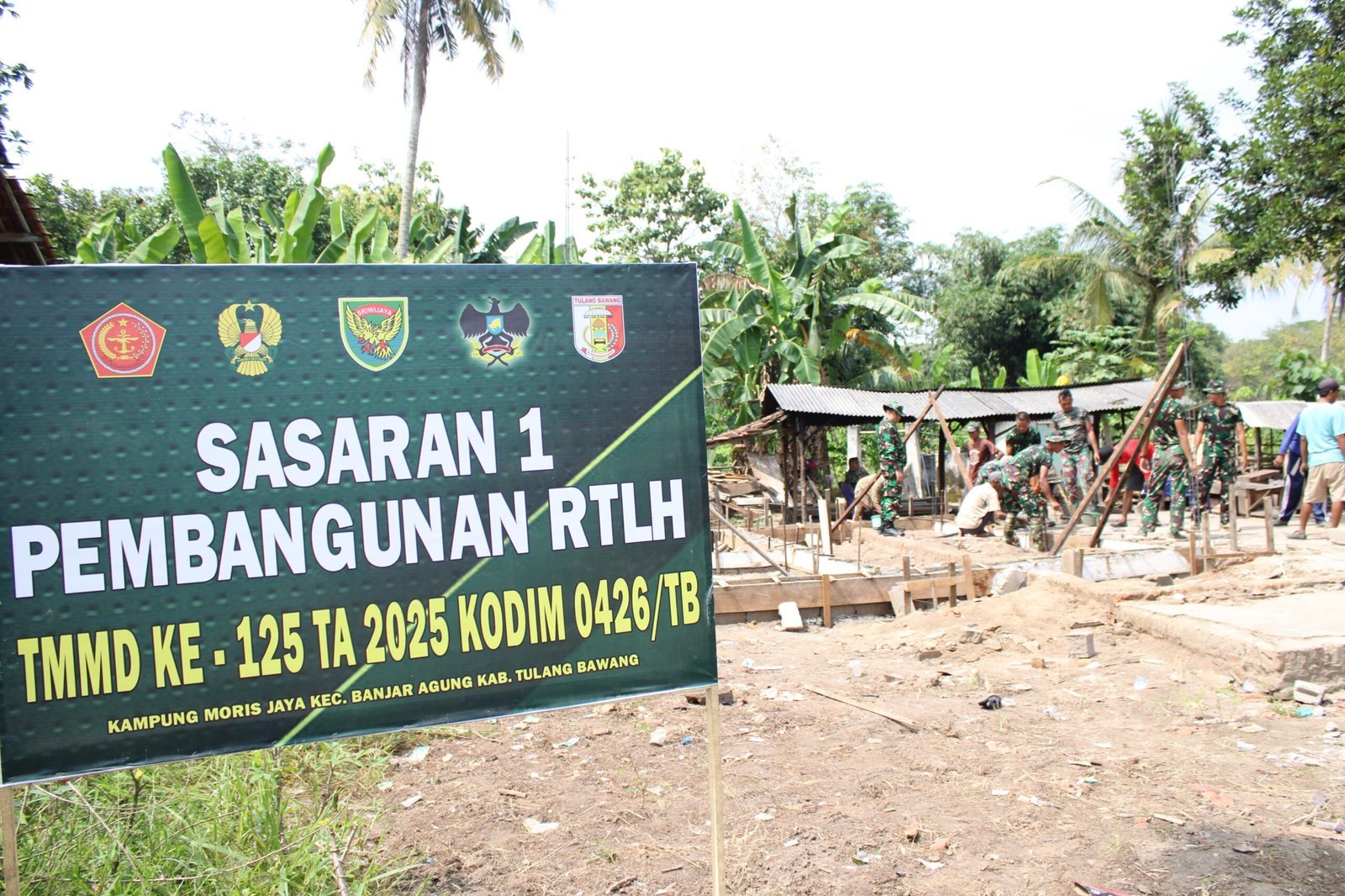 Tulang Bawang, 29 Juli 2025 — Satgas TNI Manunggal Membangun Desa (TMMD) ke-125 Kodim 0426/Tulang Bawang terus mempercepat proses pembangunan program Rumah Tidak Layak Huni (RTLH) di berbagai titik sasaran. Salah satu sasaran utama berada di Kampung Moris Jaya, Kecamatan Banjar Agung, Kabupaten Tulang Bawang.