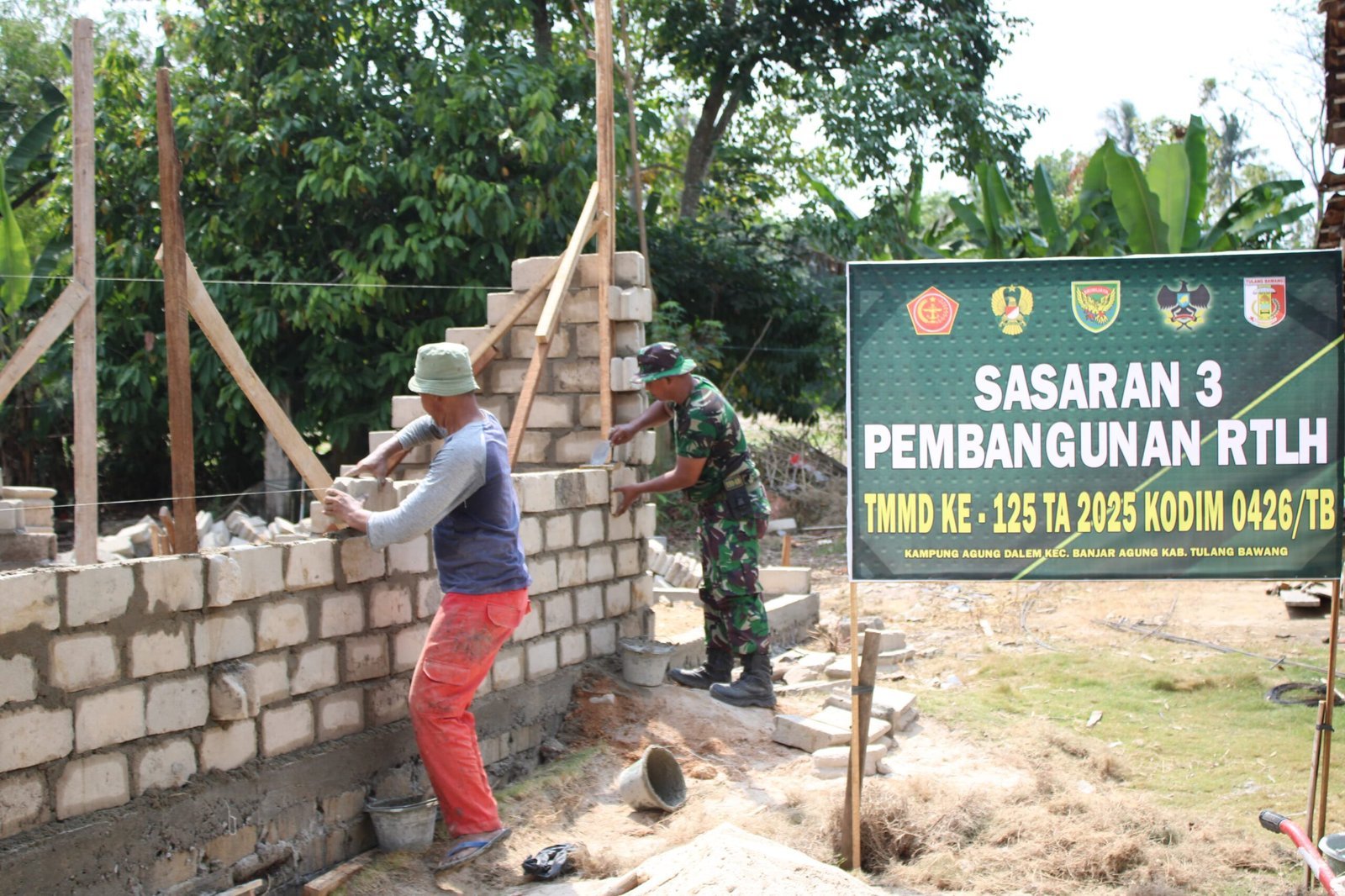 Tulang Bawang, 29 Juli 2025 — Program TNI Manunggal Membangun Desa (TMMD) ke-125 Kodim 0426/Tulang Bawang terus berlanjut dengan menyentuh berbagai aspek kebutuhan masyarakat. Salah satunya adalah program perbaikan Rumah Tidak Layak Huni (RTLH) yang saat ini menyasar rumah ketiga (sasaran 3) di Kampung Agung Dalam, Kecamatan Banjar Agung, Kabupaten Tulang Bawang.