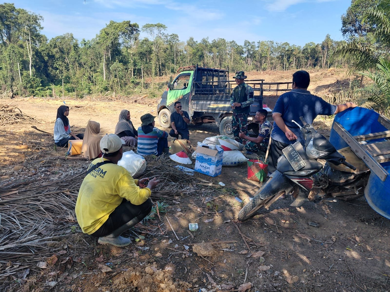 LAMANDAU – Suasana keakraban tampak jelas di lokasi kegiatan ketahanan pangan TMMD Reguler ke-125 Kodim 1017/Lamandau di Desa Batu Kotam, Kecamatan Bulik, Kabupaten Lamandau, Selasa (12/08/25). Di sela-sela pengerjaan, anggota Satgas TMMD memanfaatkan waktu istirahat dengan berkumpul dan bercengkerama bersama warga.