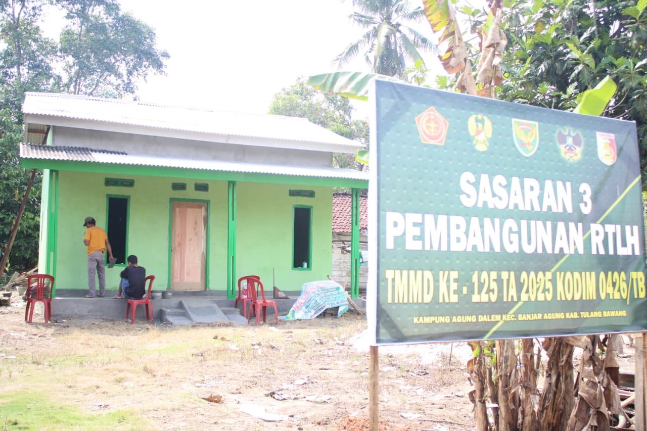 Tulang Bawang – Program TNI Manunggal Membangun Desa (TMMD) ke-125 di Kampung Agung Dalam, Kecamatan Banjar Agung, Kabupaten Tulang Bawang, terus mencatat progres signifikan. Pada Jumat (15/8/2025), Satgas TMMD melaksanakan pekerjaan lanjutan pada Rumah Tidak Layak Huni (RTLH) sasaran 3 dengan fokus pada pengecatan garis plang dan pengacian lantai teras.