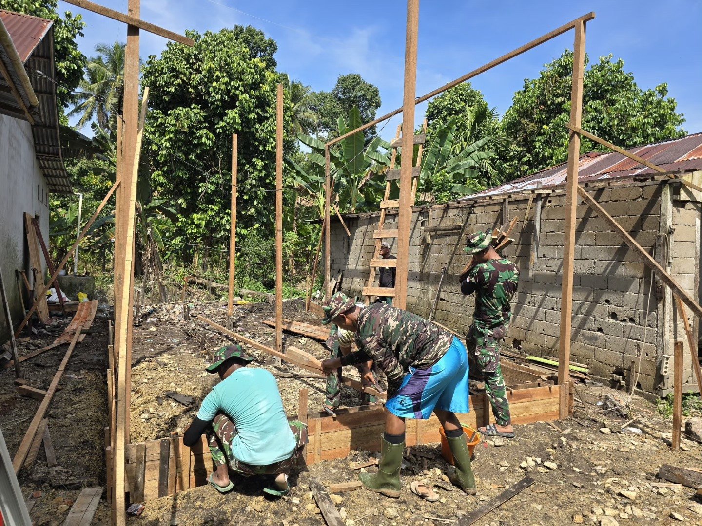Kegiatan yang dilaksanakan pada Rabu (15/10/2025) ini menjadi salah satu sasaran fisik yang membawa dampak langsung bagi masyarakat setempat. Dengan penuh semangat, anggota Satgas TMMD bersama warga bahu-membahu mendirikan tiang rumah serta menyiapkan papan mal untuk proses pengecoran pondasi bawah.