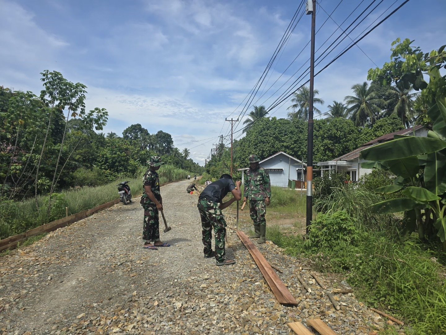Pada Rabu (15/10/2025), Satgas TMMD bersama masyarakat setempat melaksanakan tahap pemasangan papan mal sebagai langkah awal dalam proses pengecoran jalan. Kegiatan ini menjadi bagian penting dari upaya memperlancar akses transportasi warga dan meningkatkan konektivitas antarwilayah di Kecamatan Sungai Kakap.