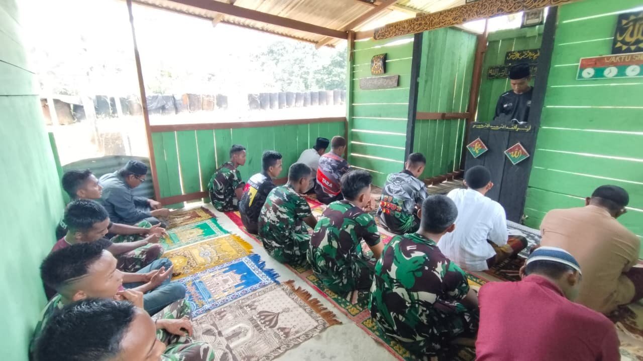 Dalam suasana khidmat, prajurit TNI terlihat duduk rapi di atas sajadah, mengikuti rangkaian ibadah Sholat Jumat. Momen ini menjadi wujud nyata dari upaya menjaga keseimbangan antara tugas negara di lapangan dan kebutuhan spiritual.