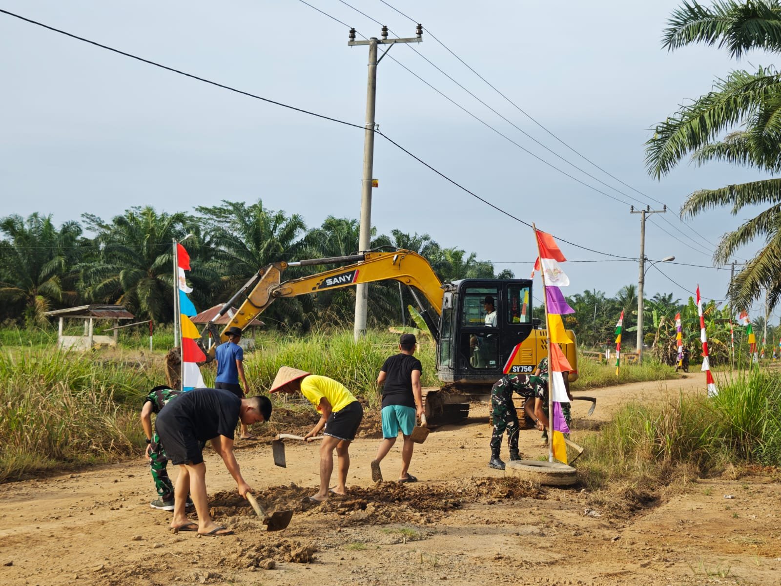 Kegiatan ini melibatkan para personel Satgas TMMD dan operator alat berat sebagai bagian dari target pembangunan jalan penghubung antar wilayah desa. Penggunaan ekskavator bertujuan untuk mempercepat proses pengerjaan dan mencapai hasil perataan jalan yang optimal.