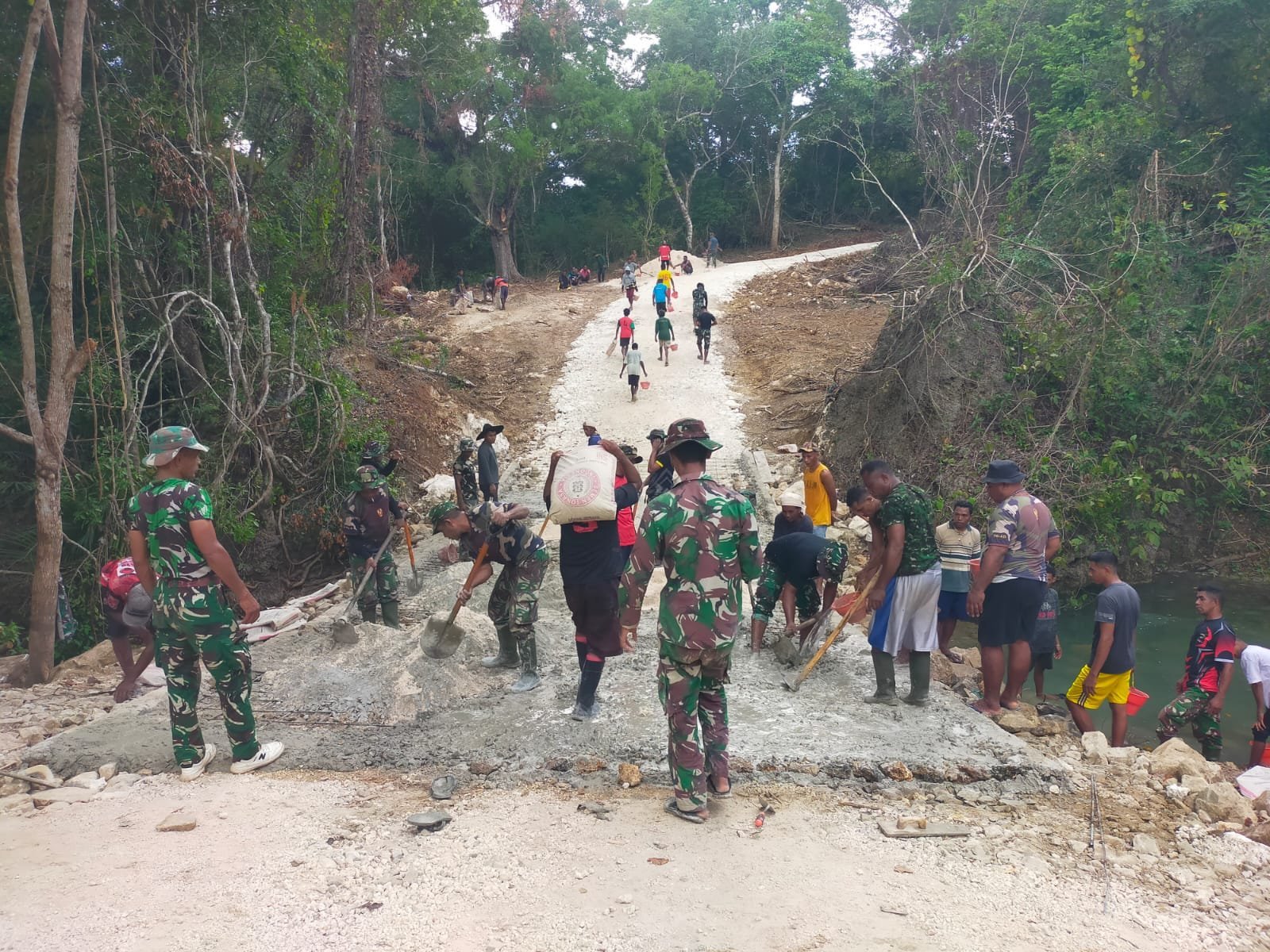 NTT-KUPANG, – Memasuki hari ke-22 pelaksanaan TNI Manunggal Membangun Desa (TMMD) Ke-124, semangat kebersamaan antara Satgas TMMD Kodim 1604/Kupang dan masyarakat Desa Huilelot, Kecamatan Semau, Kabupaten Kupang, terus bergelora. Kegiatan fisik berupa pengecoran crosway di sasaran fisik II, yaitu pembukaan dan pengerasan jalan baru sepanjang 1,4 kilometer, kini berjalan sesuai rencana. Selasa (27/05/2025).