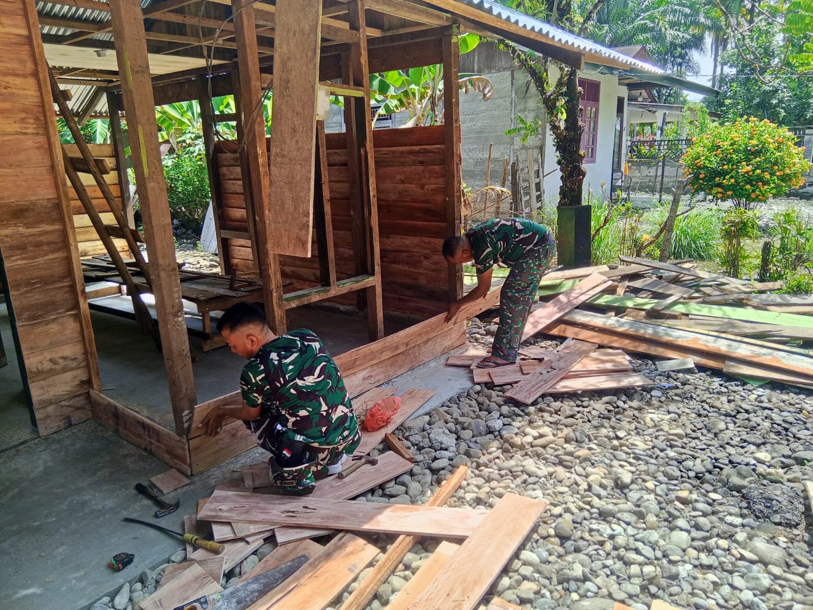 Sejak pengerjaan dimulai, prajurit Satgas TMMD bekerja tanpa mengenal lelah. Mereka membongkar bagian rumah yang tak lagi kuat, lalu menggantinya dengan material baru. Suara palu beradu menjadi irama perubahan yang perlahan menghidupkan kembali bangunan tersebut.