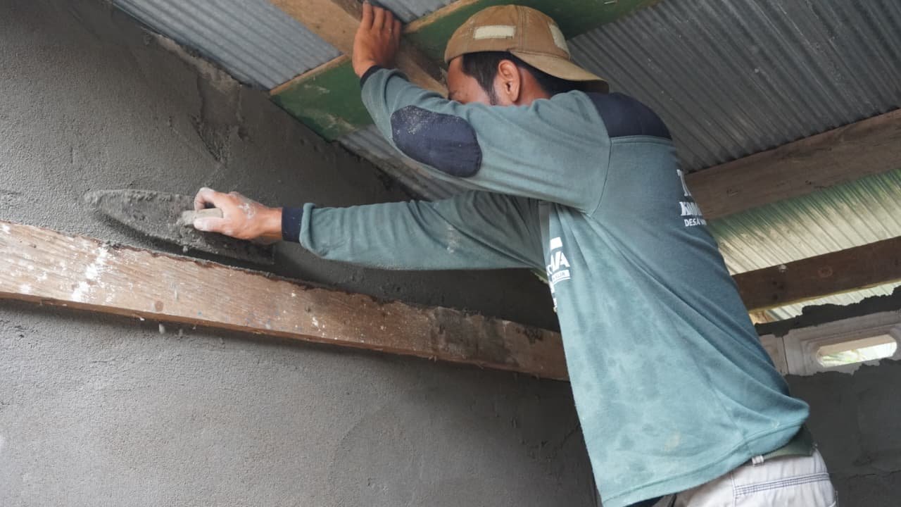 Sejak pagi hari, terlihat kolaborasi antara prajurit TNI dan warga yang secara bergotong-royong mengaduk dan meratakan plester semen pada dinding. Proses ini merupakan langkah krusial dalam menyempurnakan konstruksi sebelum memasuki tahap akhir.