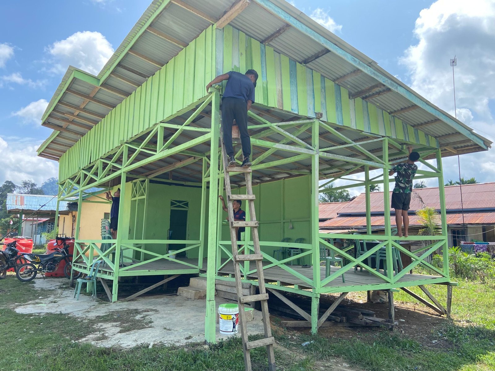 Pentas desa yang menjadi pusat berbagai aktivitas masyarakat—mulai dari pertemuan warga, kegiatan seni budaya, hingga acara resmi—kini tampil lebih segar dan menarik berkat sentuhan cat baru. Kegiatan pengecatan dilakukan secara gotong royong antara personel Satgas TMMD dan warga setempat sebagai wujud kebersamaan dalam memperindah fasilitas umum desa.