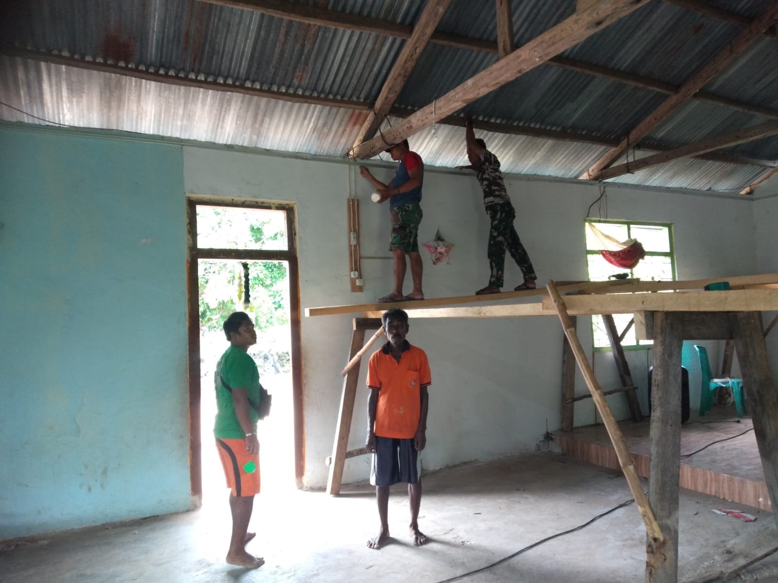 Dengan penuh semangat gotong royong, anggota Satgas TMMD bersama warga mulai memasang rangka plafon yang telah diukur sebelumnya. Pekerjaan dilakukan dengan cermat dan teliti agar hasilnya rapi dan kuat.
