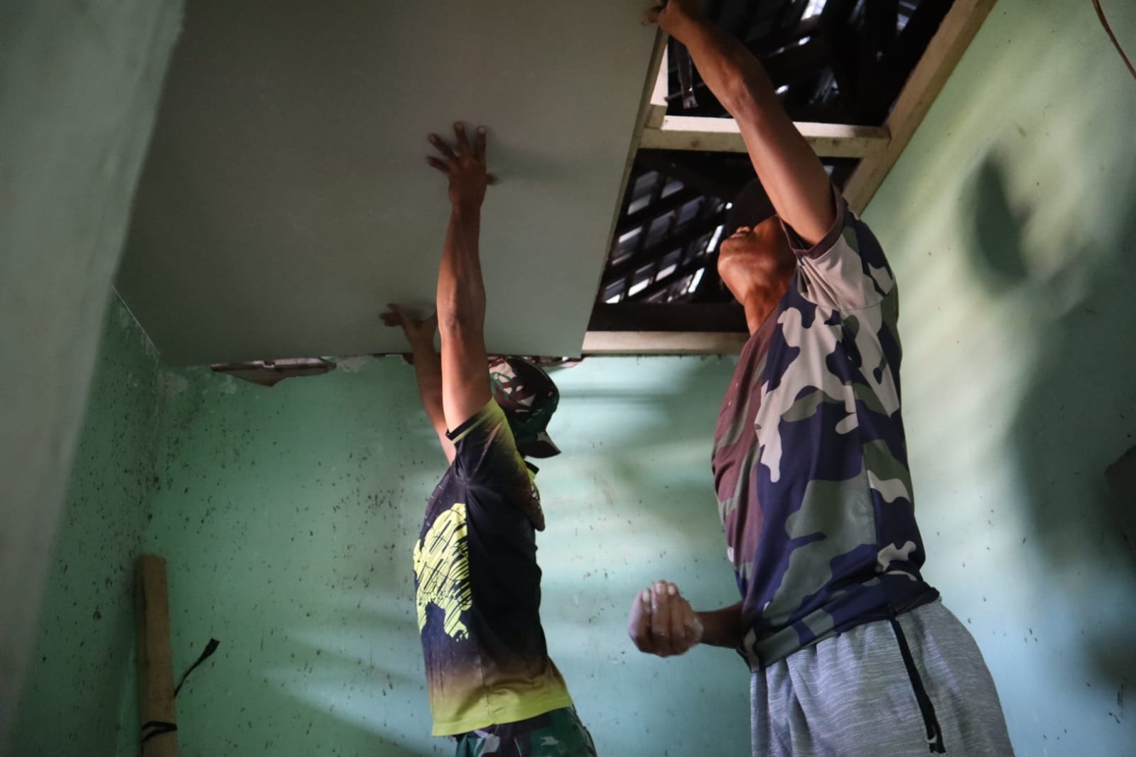 Anggota Satgas TMMD bersama masyarakat bahu membahu menyelesaikan tahap ini dengan penuh semangat. Mereka memastikan setiap detail pemasangan plafon berjalan dengan tepat demi menjamin kualitas dan kenyamanan jangka panjang bagi penerima manfaat.