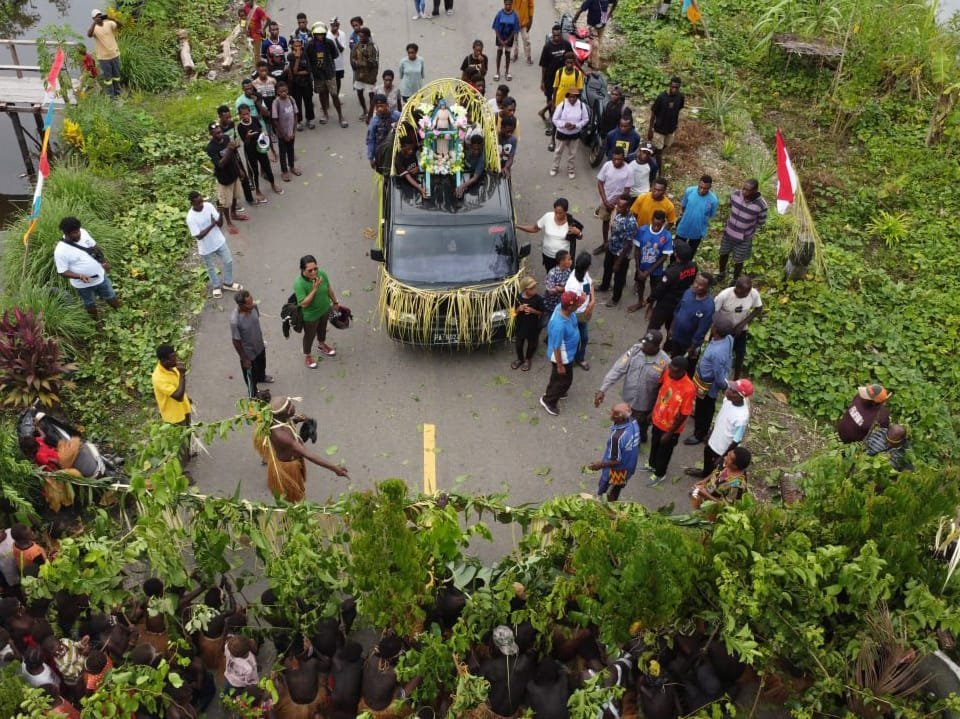 Timika, 10 Mei 2025 – Warga Kampung Pigapu, Distrik Iwaka, Kabupaten Mimika, merayakan Bulan Maria dengan penuh semangat dan kebersamaan melalui arak-arakan Patung Bunda Maria. Acara tersebut tidak hanya menjadi momen penting bagi umat Katolik, tetapi juga menunjukkan kemanunggalan TNI dengan masyarakat, dengan Satgas TNI Manunggal Membangun Desa (TMMD) ke-124 Kodim 1710/Mimika turut berpartisipasi dalam memeriahkan acara.