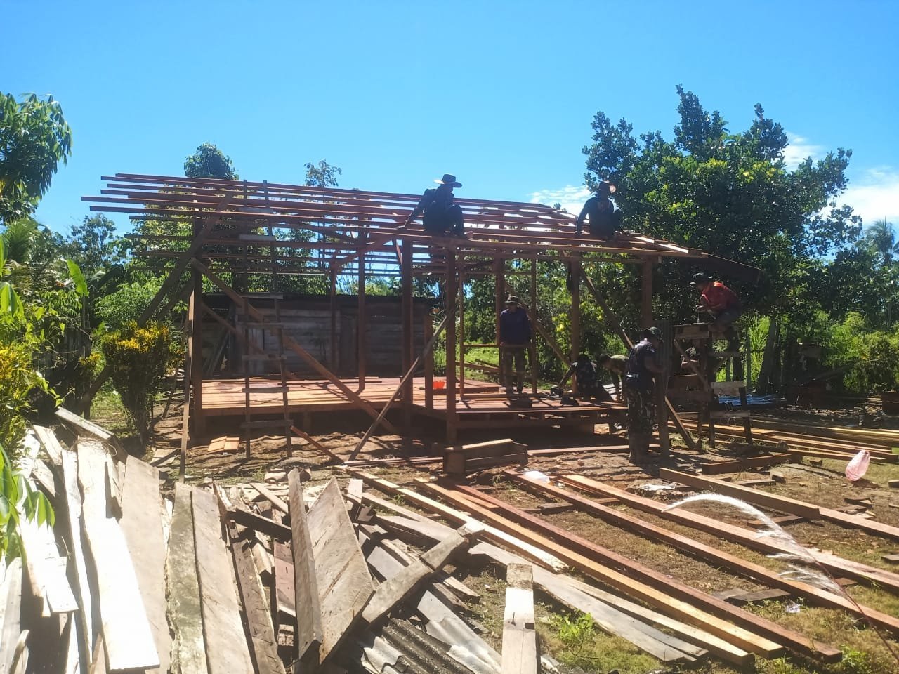 Beberapa personel TNI terlihat naik ke bagian atas kerangka rumah dengan menggunakan peralatan sederhana namun tetap mematuhi aspek keselamatan kerja. Proses ini juga melibatkan warga yang membantu dari bawah untuk menyerahkan bahan dan mengatur posisi kerangka.