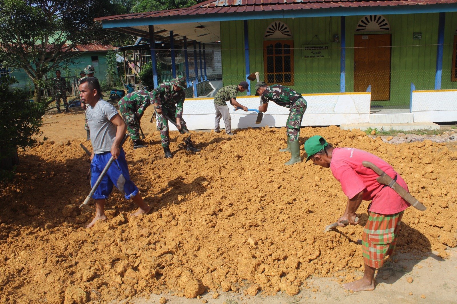 Dengan menggunakan alat seadanya seperti cangkul dan sekop, para personel TNI dan warga saling bahu-membahu menimbun dan meratakan halaman. Gotong royong ini menjadi bukti nyata kemanunggalan TNI dan rakyat dalam segala aspek kehidupan.