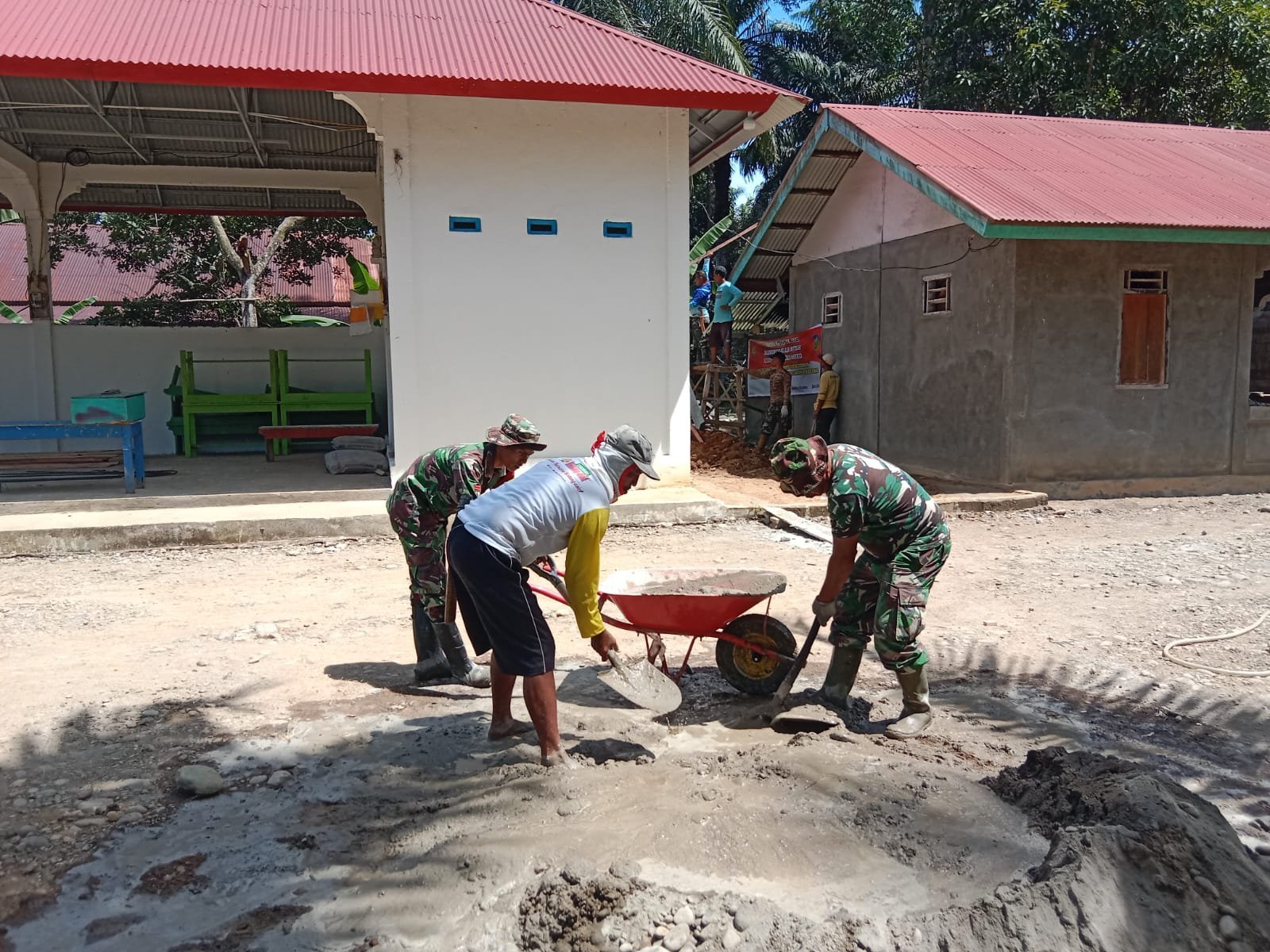 Dengan menggunakan sekop dan ember, anggota Satgas mencampur pasir dan semen secara merata sebelum ditambahkan air. Proses pencampuran ini memerlukan kekuatan fisik dan ketelitian agar menghasilkan adukan yang padat dan tidak cepat retak saat mengering.