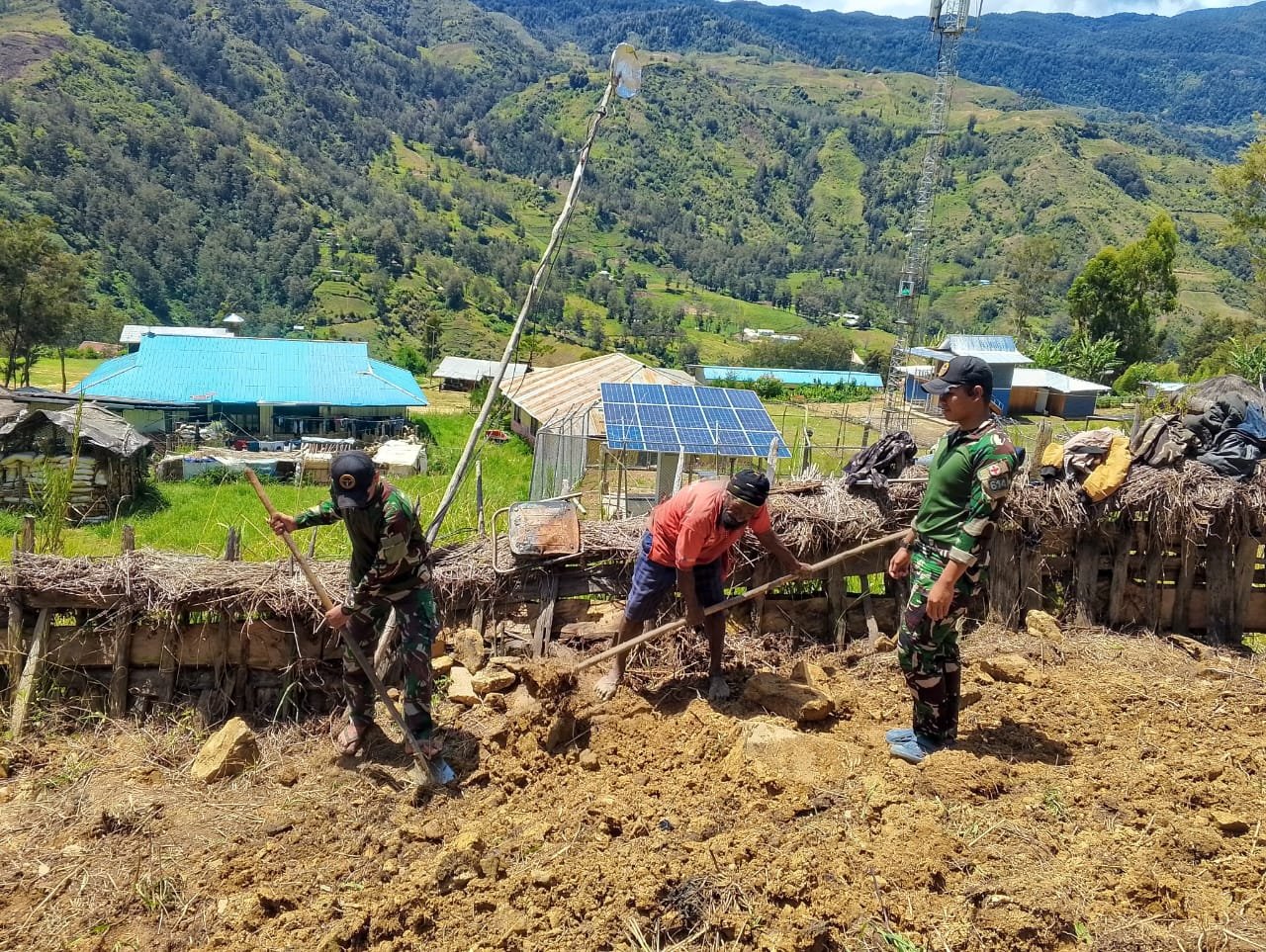 LANNY JAYA – Satgas Yonif 614/RJP Pos Balingga melaksanakan kegiatan membuka lahan baru untuk lahan perkebunan yang bertempat di kampung Balingga, Distrik Balingga, Kabupaten Lanny Jaya, Papua Pegunungan, Jum’at (28/2/2025).