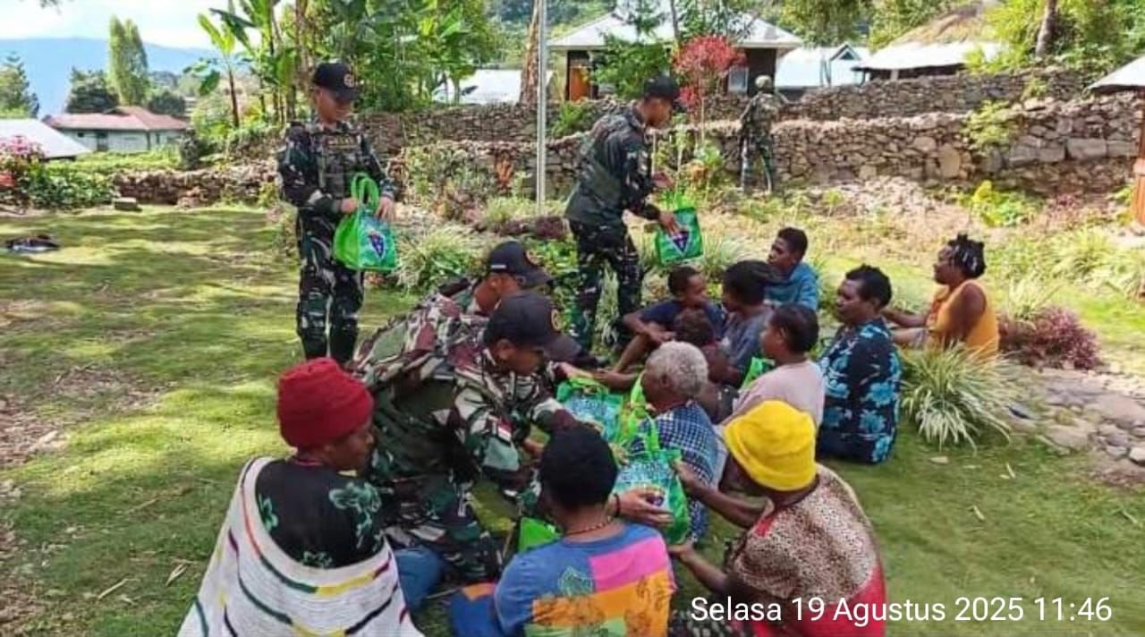 TOLIKARA – Satgas Yonif 614/RJP Pos Kanggime melaksanakan anjangsana sekaligus membagikan paket sembako kepada masyarakat di Desa Kanggimaluk, Distrik Kanggime, Kabupaten Tolikara, Papua Pegunungan, Selasa (19/8/2025).