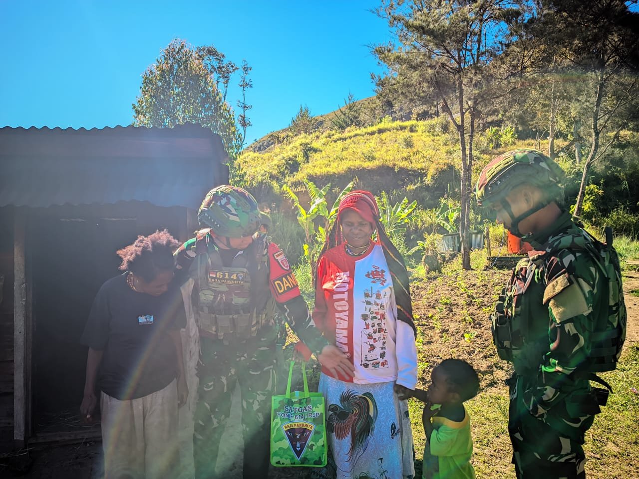 LANNY JAYA – Prajurit Satgas Yonif 614/RJP Pos Malagayneri melaksanakan kegiatan Minggu Kasih dengan membagikan bantuan Sembako kepada warga di Kampung Lowanom, Distrik Malagayneri, Kabupaten Lanny Jaya, Papua Pegunungan, Minggu (03/8/2025).