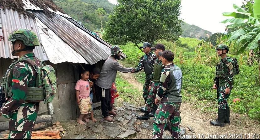 TOLIKARA – Pos Kanggime Satgas Yonif 614/RJP melaksanakan Anjangsana dan Pembagian sembako serta Pelayanan Kesehatan kepada Bapak Rio Wanimbo (49) yang merupakan Tokoh Masyarakat Desa Kanggimaluk, Distrik Kanggime, Kabupaten Tolikara, Papua Pegunungan, Kamis, (16/01).