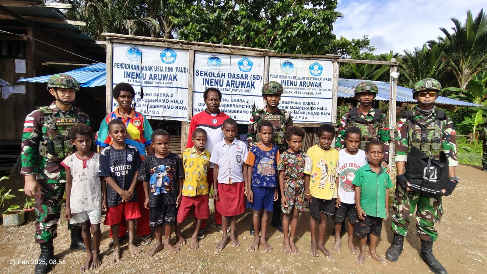 MEMBERAMO RAYA – Dalam mencetak generasi penerus bangsa dan meraih cita-cita, Satgas Pamtas RI-PNG Kewilayahan Yonif 614/RJP Pos Dabra membagikan seragam sekolah gratis kepada siswa-siswi SD Anunek Aruwak yang bertempat di Kampung Dabra Dua, Distrik Memberamo Hulu, Kabupaten Memberamo Raya, Prov.Papua, Jumat ( 21/2/2025)