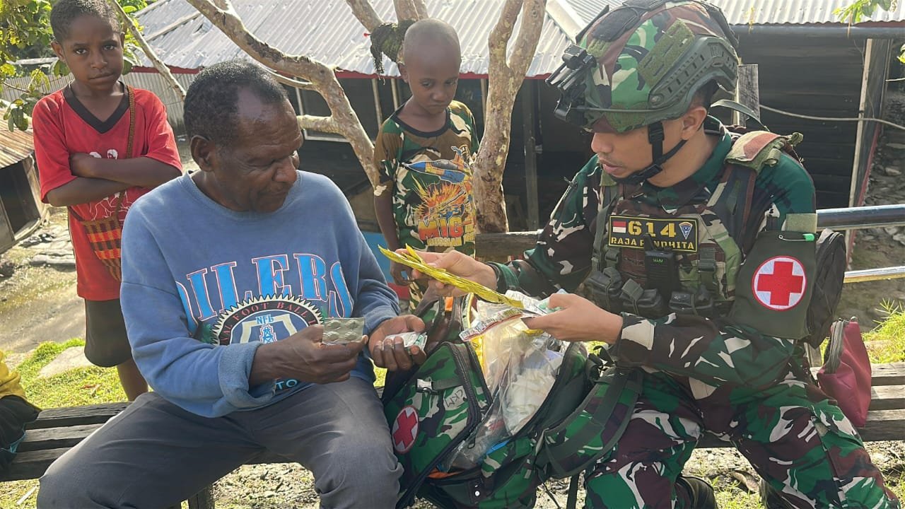 TOLIKARA – Personel Pos Karubaga Satgas Pamtas RI-PNG Kewilayahan Yonif 614/RJP memberikan pelayanan kesehatan gratis kepada masyarakat di Desa Muara, Distrik Karubaga, Kabupaten Tolikara, Papua Pegunungan.