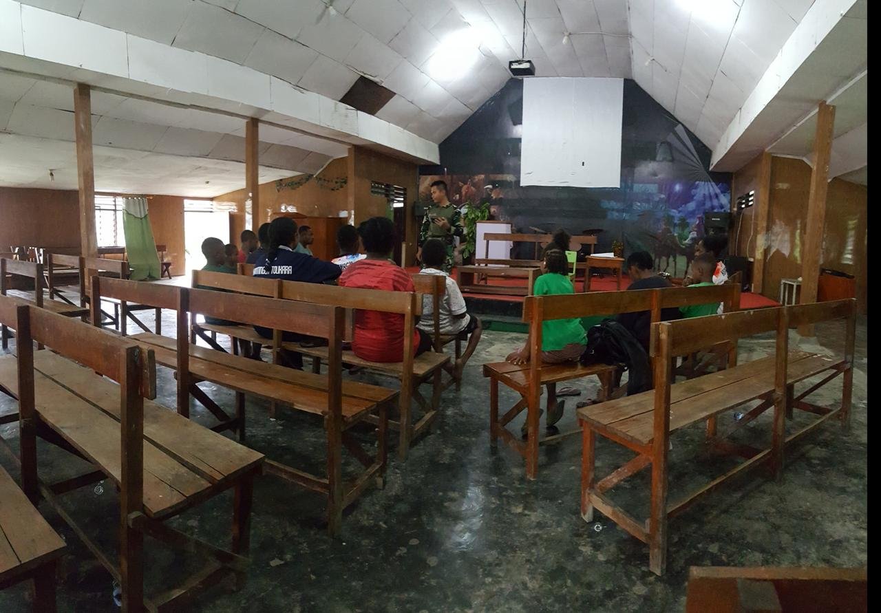 Kali ini personel Pos Karubaga yang dipimpin oleh Sertu Yoel mengajarkan cara bermain alat musik gitar kepada anak-anak gereja GIDI Karubaga.