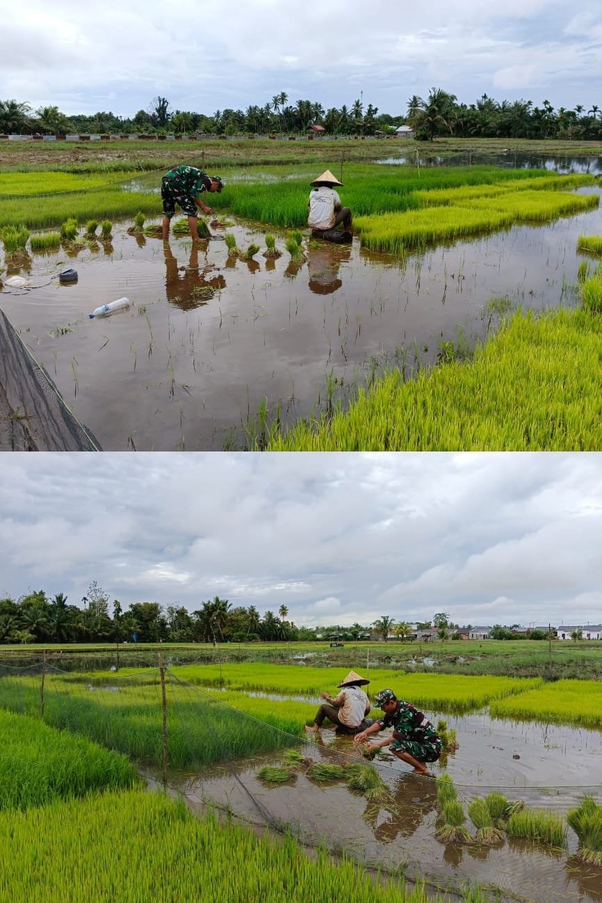 Sebagai Motor Penggerak Ketahanan Pangan, Babinsa Koramil 04/Meureubo Bantu Petani Cabut Bibit Padi