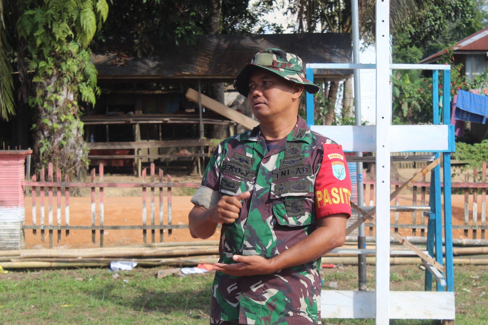 Lamandau – Menjelang dimulainya aktivitas harian program TNI Manunggal Membangun Desa (TMMD) Reguler ke-125, Perwira Seksi Teritorial (Pasi Ter) Kodim 1017/Lamandau Kapten Inf Eko Yunianto mengambil apel pagi di halaman Kantor Desa Batu Kotam, Sabtu (26/07/25).