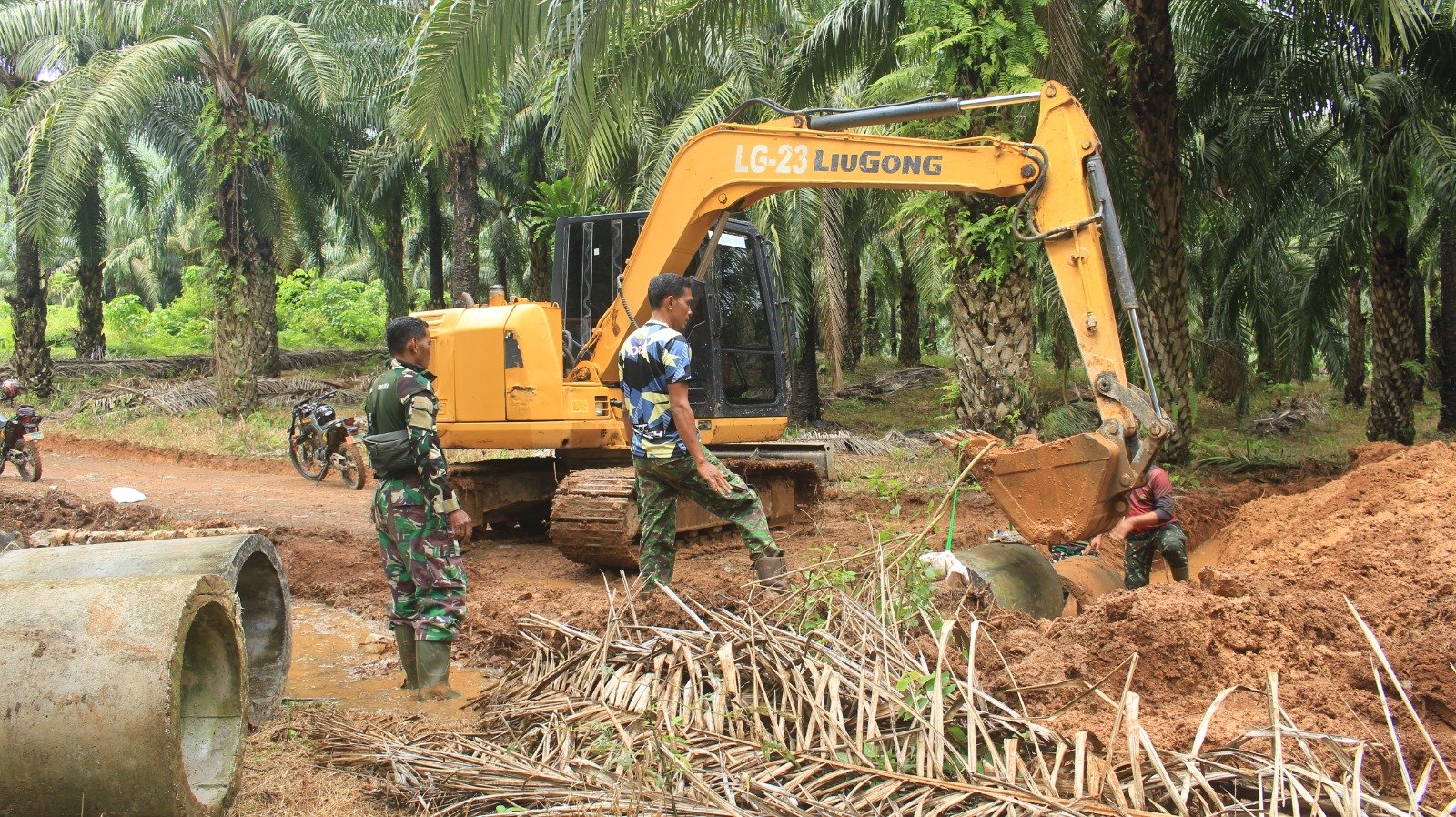 Tak butuh waktu lama, hari ini juga Minggu (18/05/2025), Empat (4) buah gorong-gorong berdiameter Satu (1) meter didatangkan dan langsung dipasang oleh Satgas TMMD bersama warga Desa Gunung Melati dengan bantuan alat berat Excavator.