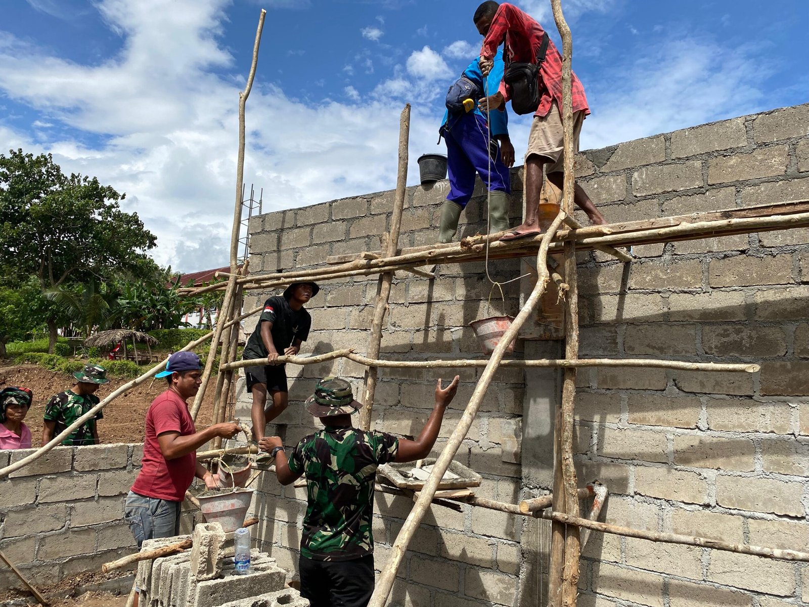 Sejak pagi hari, personel TNI dan warga setempat telah membagi tugas dengan teratur. Beberapa di antaranya bertanggung jawab untuk menyusun batako dengan presisi, sementara yang lain menyiapkan campuran semen dan melakukan pengecoran demi memastikan kekuatan bangunan yang dibangun.