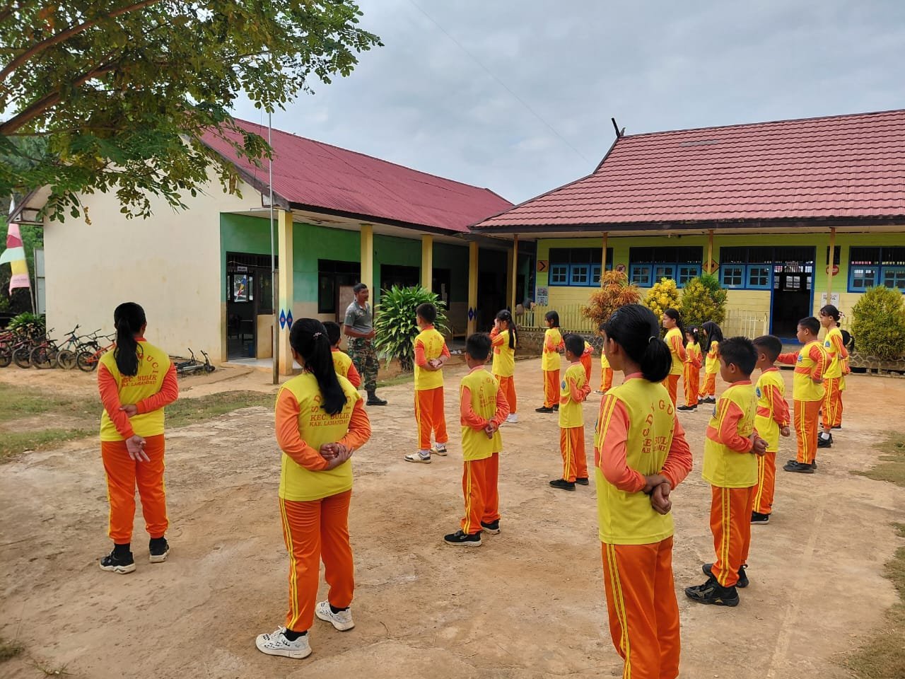 Dengan senyum ramah dan gerakan penuh energi, Sertu Sri Wiyono mengajak para siswa bergerak mengikuti irama musik. Anak-anak pun tampak bersemangat, melompat dan meregangkan tubuh sambil tertawa riang.