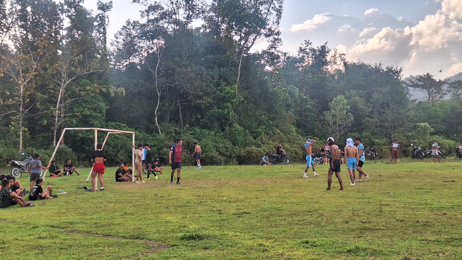 Warga desa terlihat antusias mengikuti kegiatan ini, menunjukkan bahwa sepak bola adalah olahraga yang populer dan digemari oleh berbagai kalangan.