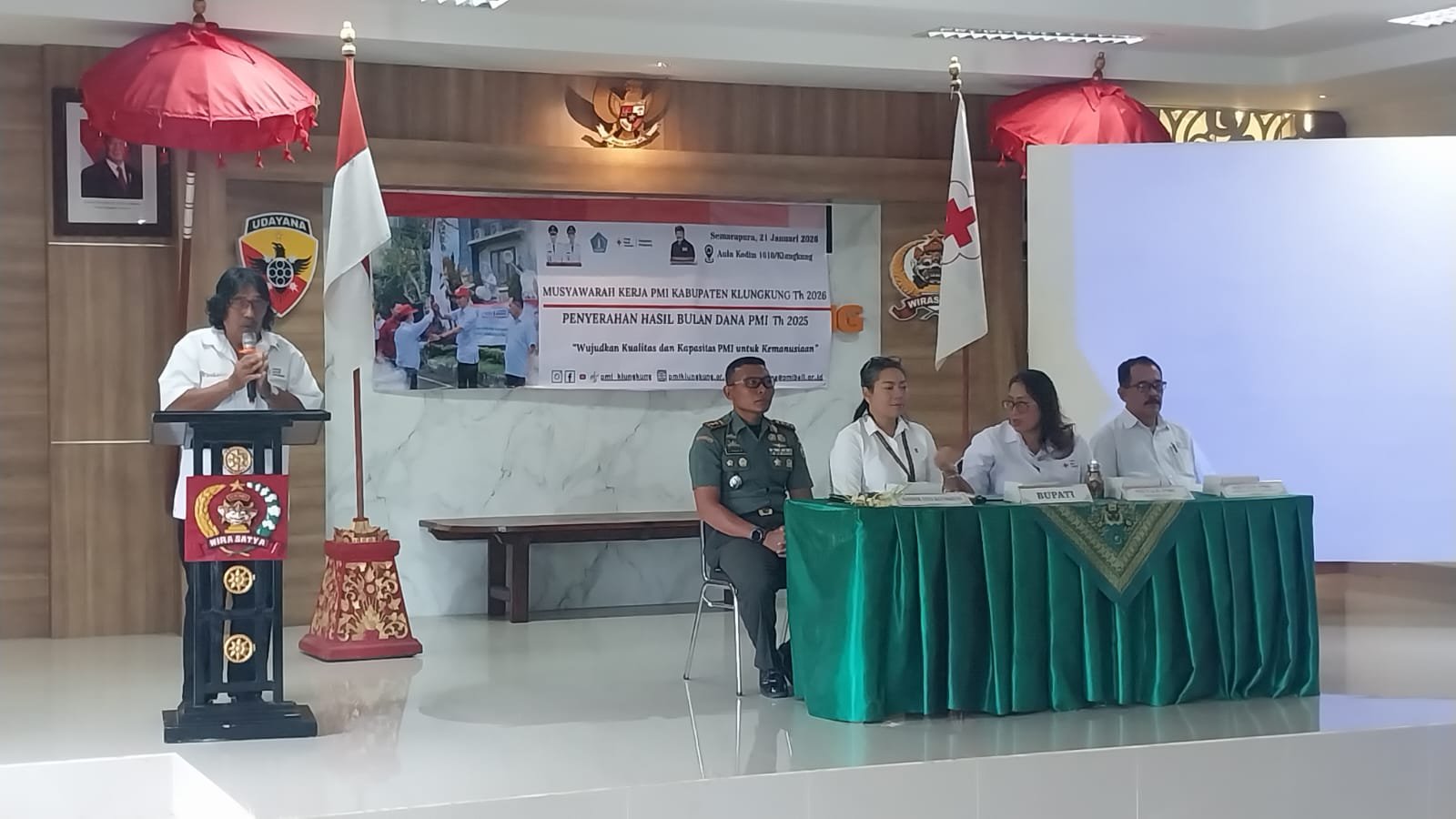Klungkung, Rabu (21/01/26) – Musyawarah Kerja Kabupaten (Mukerkab) PMI Kabupaten Klungkung tahun 2026 resmi dibuka di Aula Makodim 1610/Klungkung. Acara ini dihadiri oleh Dandim 1610/Klungkung, Letkol Kav Sidik Pramono, S.Sos., M.M., M.Han, beserta berbagai perwakilan dari pemerintahan dan organisasi terkait, termasuk Staf Ahli Bidang Hukum, Politik, dan Pemerintahan, Ni Made Sulistiawati, S.H., M.H.
