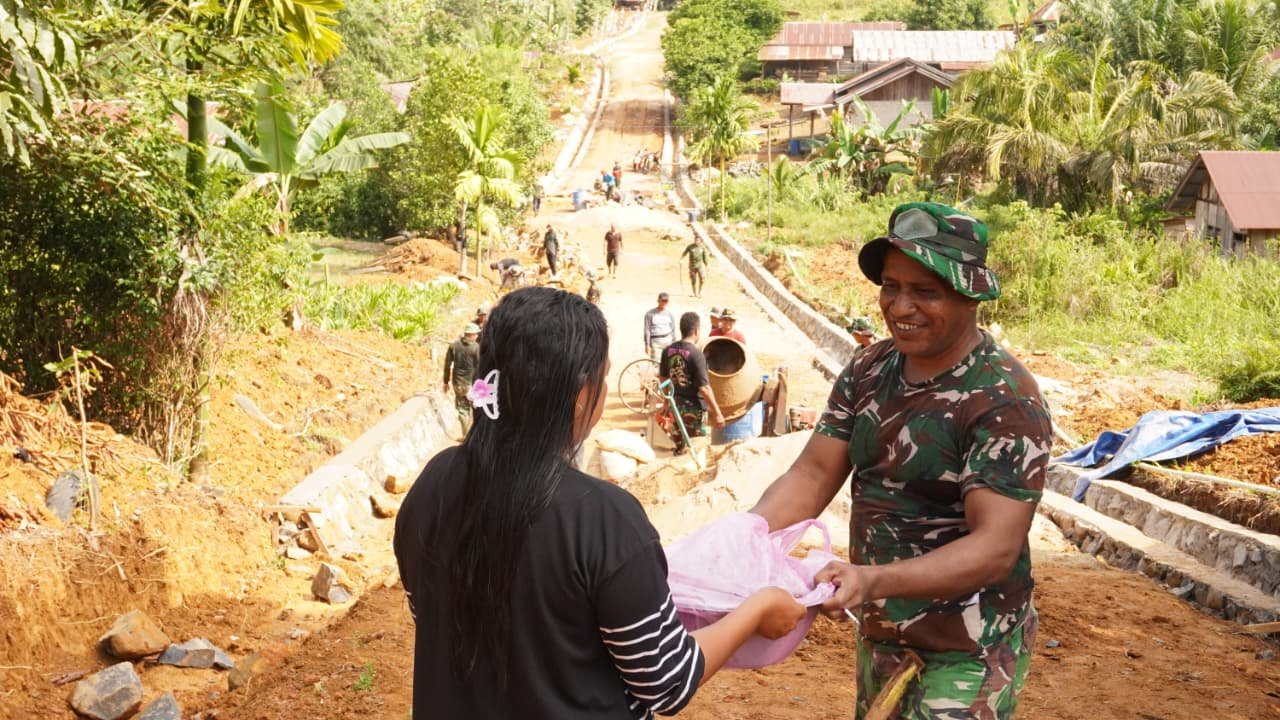 Kotawaringin Timur – Selama pelaksanaan program pembangunan di Desa Tribuana, Kecamatan Telaga Antang, Kabupaten Kotawaringin Timur, tercermin keharmonisan antara masyarakat dan anggota Satgas TMMD Reguler ke-127 Kodim 1015/Sampit. Pada Rabu (11/02/2026), warga setempat menyuguhkan kue buatan sendiri kepada para prajurit sebagai bentuk dukungan moril.