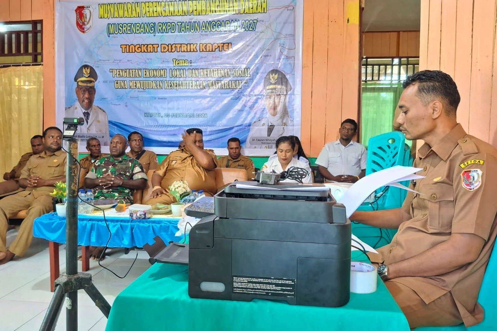 Dalam sambutannya, Kepala Distrik Kaptel Fransisco Rumpaa, S.H., menegaskan pentingnya sinergi dan pengawasan bersama dalam pelaksanaan pembangunan sesuai aturan dan kemampuan anggaran desa.