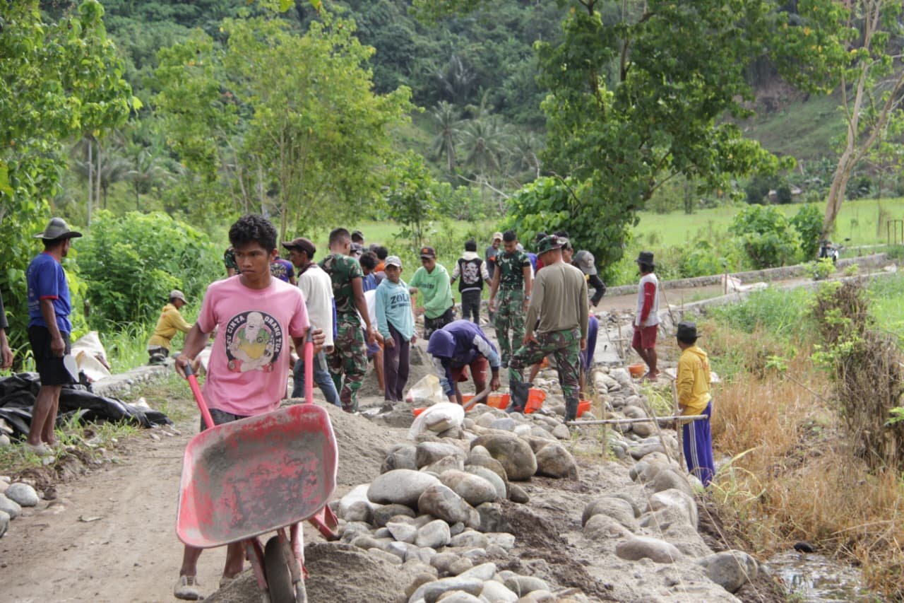 Di lokasi, terlihat jelas kerjasama erat antara TNI dan masyarakat. Mereka bekerja sama dalam mengangkut material, meratakan badan jalan, dan menyusun batu untuk talud penahan tanah. Semangat gotong royong yang tinggi mencerminkan kemanunggalan antara TNI dan rakyat.