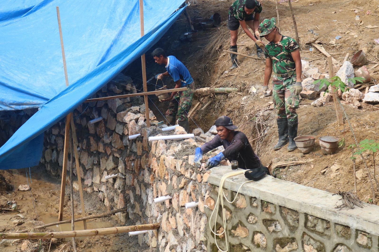 Kendari – Kerja sama antara Satgas TMMD ke-127 dan masyarakat setempat kembali terlihat dalam pembangunan talud di Kota Kendari pada Kamis (26/2). Anggota Satgas dan warga saling membantu dengan mengangkat batu, mencampur semen, serta menyusun material dengan rapi sehingga talud yang dibangun memiliki daya tahan yang baik dalam jangka panjang.