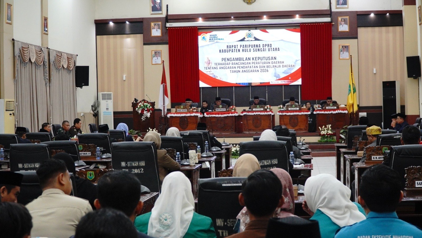 Rapat paripurna tersebut dipimpin langsung oleh Ketua DPRD HSU dan dihadiri unsur Forkopimda, kepala SKPD, serta tamu undangan lainnya. Agenda utama rapat adalah penyampaian pendapat akhir fraksi-fraksi DPRD sekaligus pengambilan keputusan terhadap Raperda APBD Tahun Anggaran 2026 yang selanjutnya ditetapkan menjadi Peraturan Daerah.