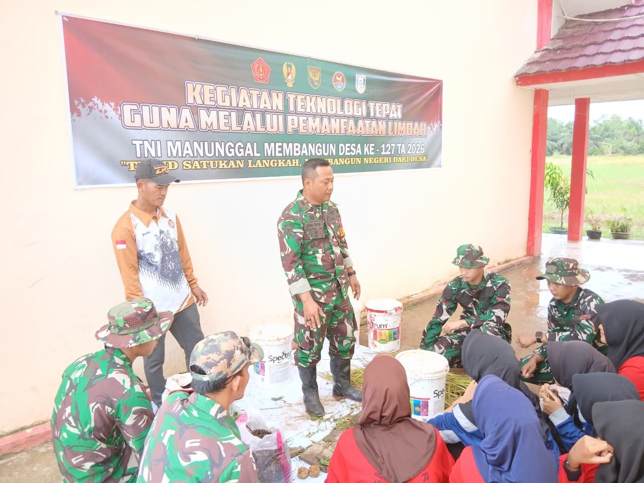 Banyuasin – Anggota Satuan Tugas (Satgas) TNI Manunggal Membangun Desa (TMMD) ke-127 Kodim 0430/Banyuasin berkolaborasi dengan siswa SMPN 3 Pulau Rimau di Desa Wonosari untuk melaksanakan kegiatan berbasis teknologi tepat guna. Kegiatan ini berfokus pada pemanfaatan limbah jerami padi menjadi pupuk organik.