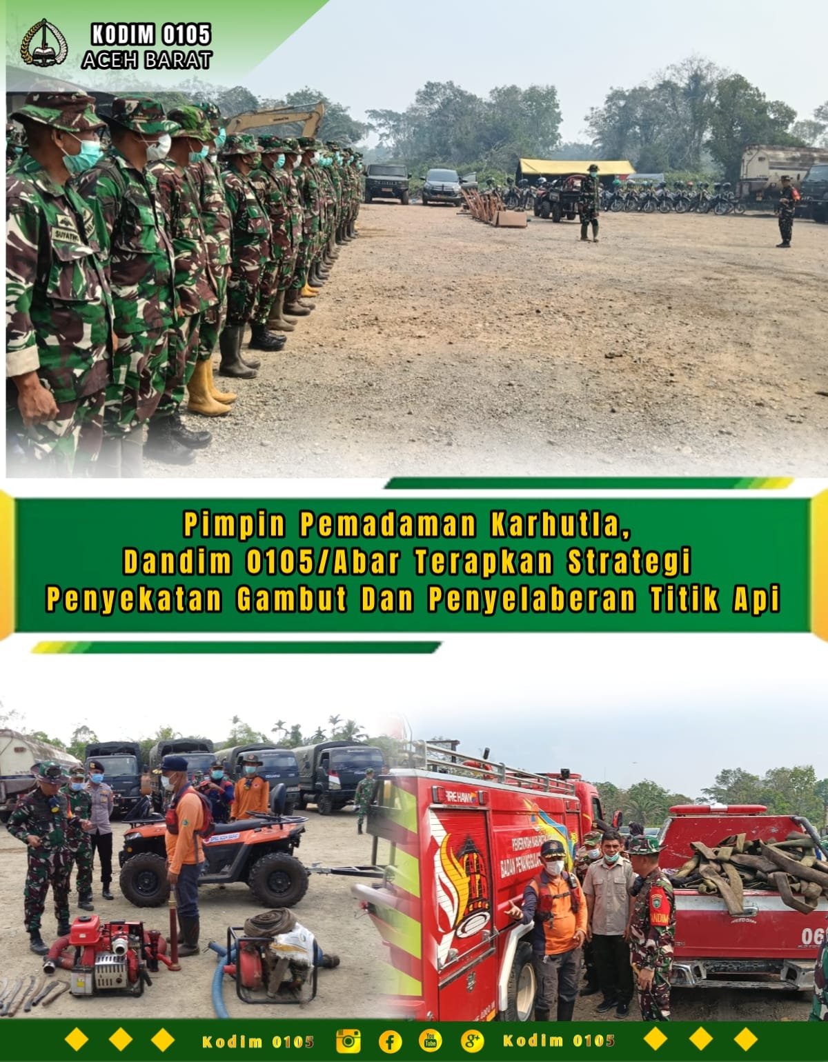 Sebelum melaksanakan aksi pemadaman, Dandim terlebih dahulu memimpin apel gabungan serta melakukan pengecekan kesiapan personel dan kelengkapan sarana prasarana alat pemadam, seperti mesin robin, mobil tangki air, cangkul, parang, ember, serta perlengkapan pendukung lainnya.
