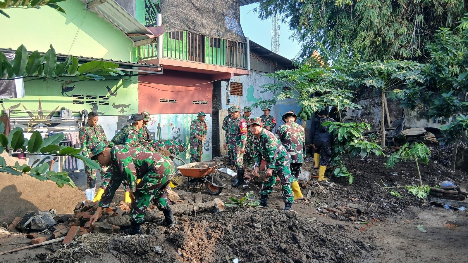 Kelurahan Mayure, serta Kelurahan Kekalik Jaya. Dengan perlengkapan korve, sepatu boot, dan pakaian lapangan, para personel TNI menyisir sisa material banjir seperti sampah, lumpur, dan puing yang menumpuk di sepanjang wilayah tersebut.Pengerahan ini melibatkan kekuatan gabungan dari Komando Rayon Militer (Koramil) 01/Cakranegara dan Koramil 09/Ampenan, serta didukung personel dari Koramil 04/Gerung, 05/Mataram, 06/Sekotong, 07/Gunungsari, dan 08/Narmada. Kegiatan dipimpin langsung oleh para Danramil masing-masing wilayah.
