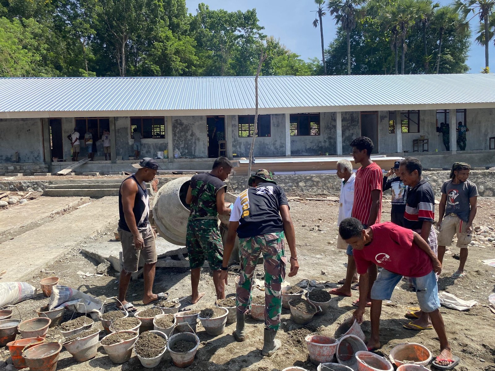 NTT-KEFAMENANU, Selasa (11/03/2025)., Meski terik matahari menyengat, tak sedikit pun semangat personel Satgas TMMD Ke-123 Kodim 1618/TTU dan warga Desa Lanaus surut. Mereka terus berjibaku menyelesaikan pembangunan gedung baru SDN Lanaus, yang kini memasuki tahap akhir perapihan di berbagai sisi bangunan.