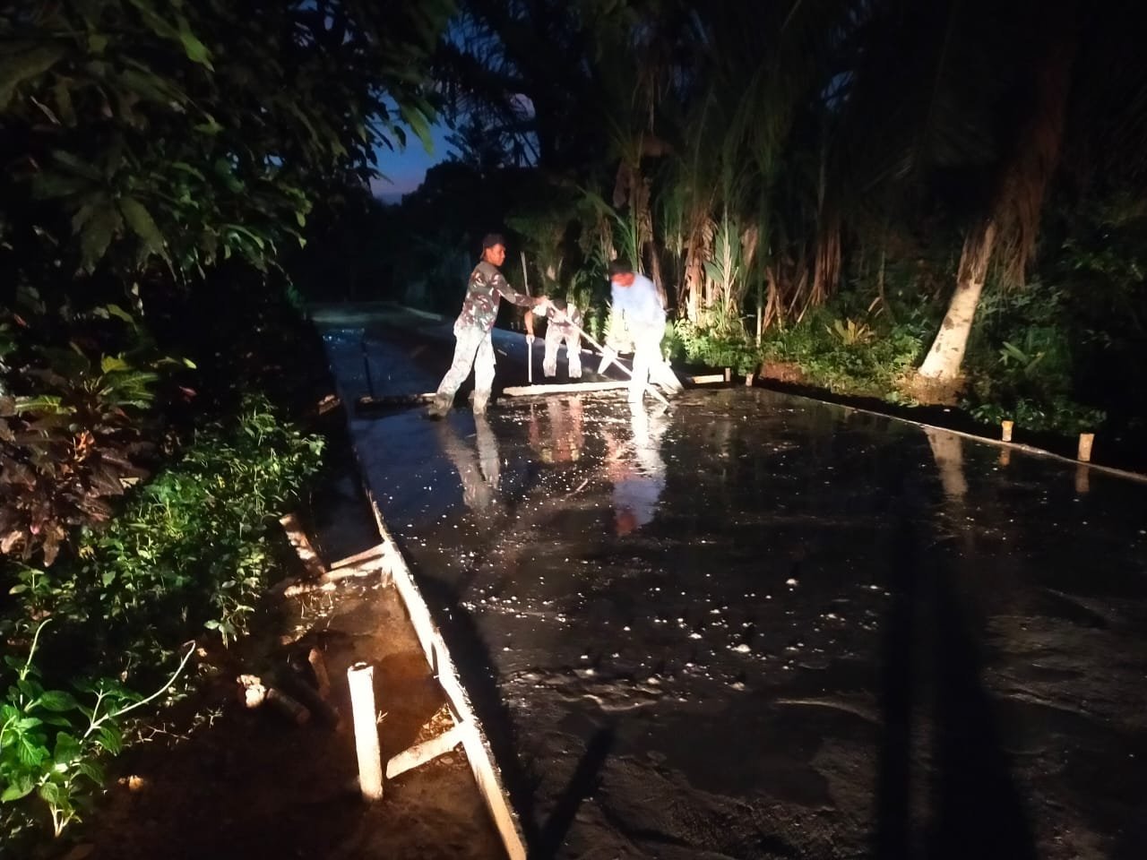 Dalam proses pengecoran, tampak personel TNI bersama warga saling bahu-membahu mengangkat material, meratakan cor, hingga memastikan hasil akhir kuat dan rapi. Gotong royong menjadi kekuatan utama dalam mempercepat pekerjaan.