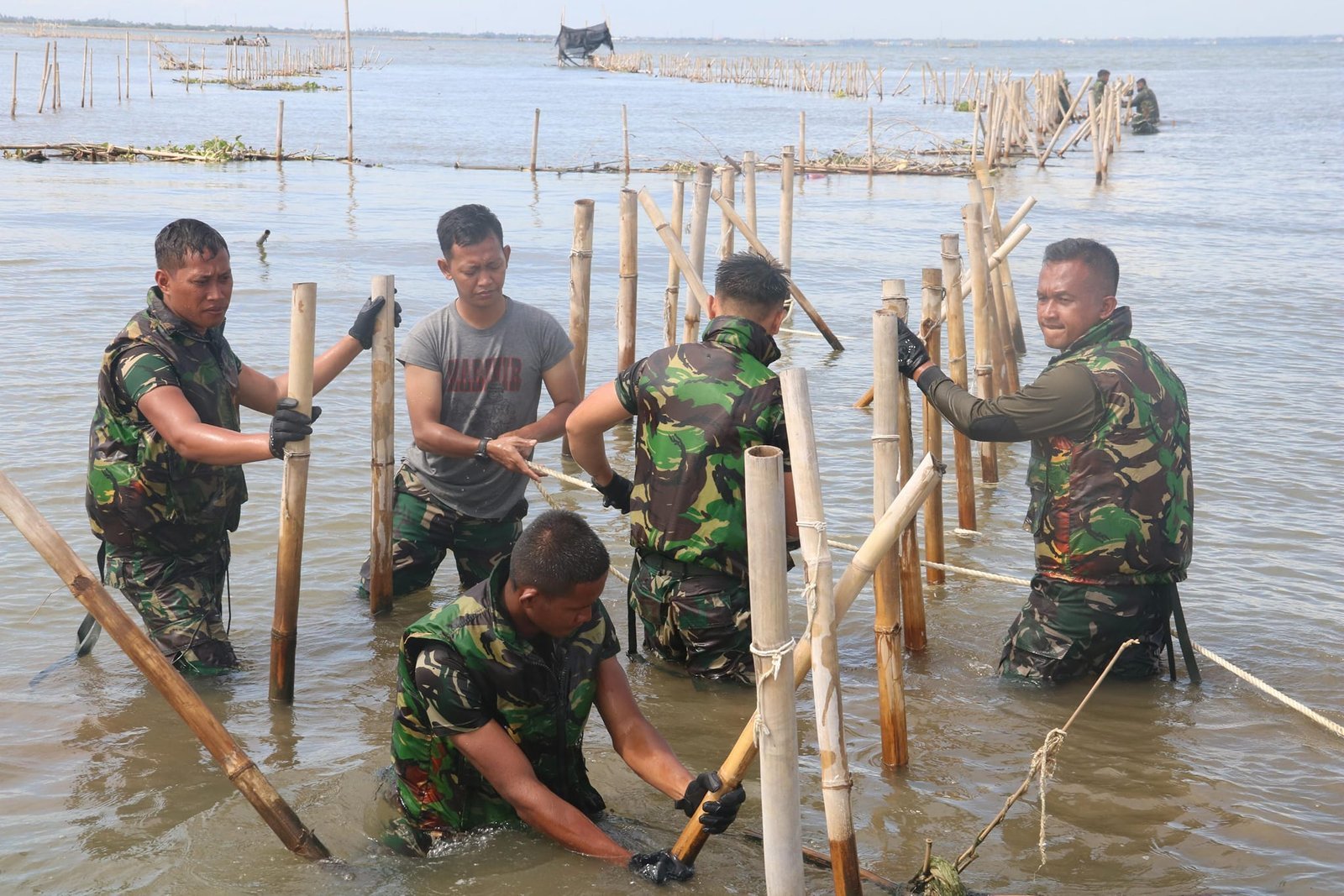 Tannpa kenal lelah prajurit petarung Yonif 4 Mar berjuang mencabuti satu persatu batang bambu yang ditancap sepanjang 30 kilometer hingga membentuk sebuah pagar laut yang menyulitkan nelayan untuk pergi mencari nafkah dengan mencari ikan.