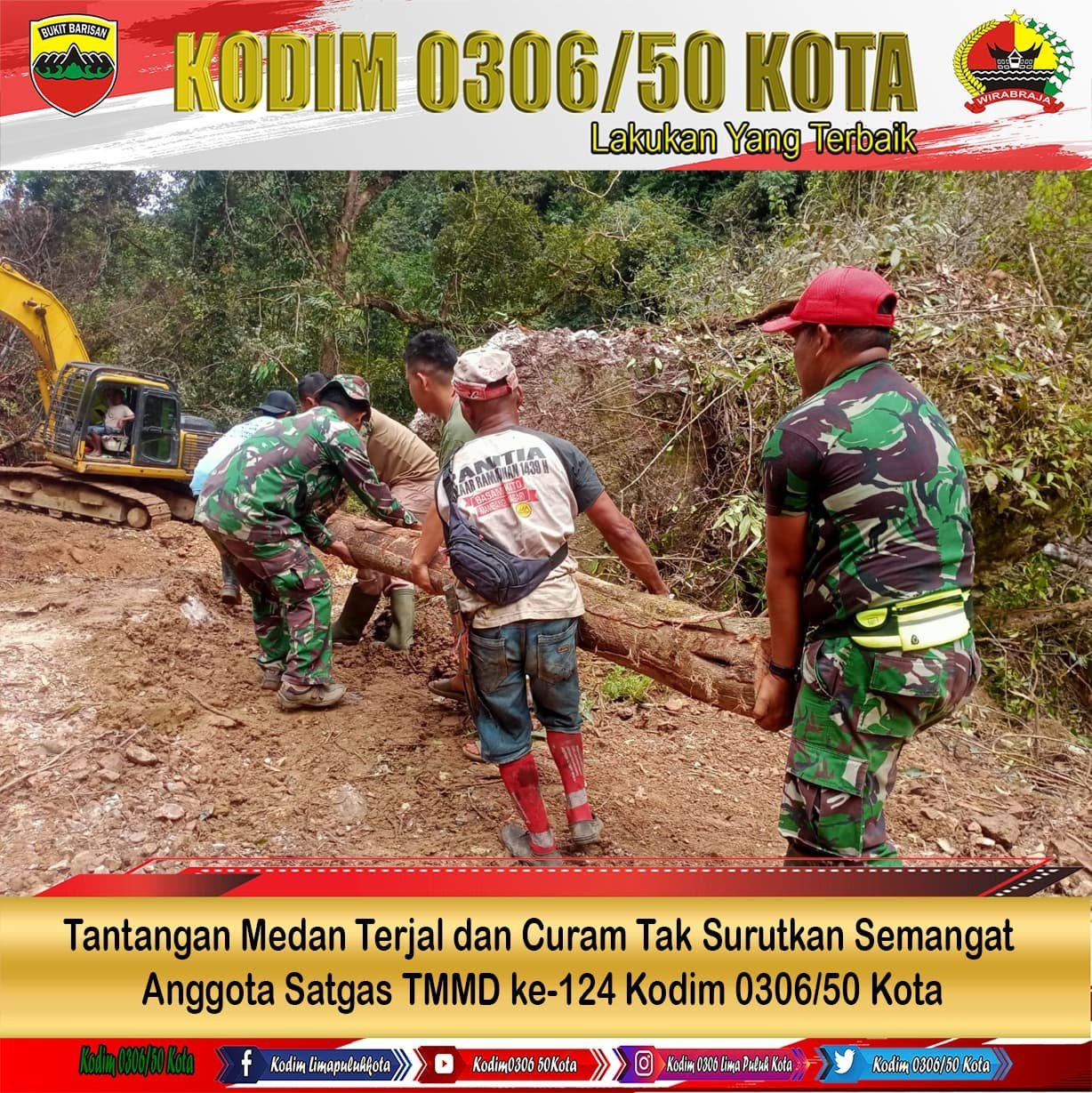 Komandan Kodim 0306/50 Kota selaku Dansatgas TMMD ke 124 Kodim 0306/50 Kota Letkol Inf Ucok Namara S,I,P, menyampaikan bahwa medan berat ini tidak menyurutkan semangat para anggota Satgas. “Kami menyadari bahwa medan yang dihadapi sangat menantang. Namun, semangat kebersamaan antara TNI dan masyarakat menjadi modal utama kami dalam menyelesaikan pekerjaan ini, “ujarnya.